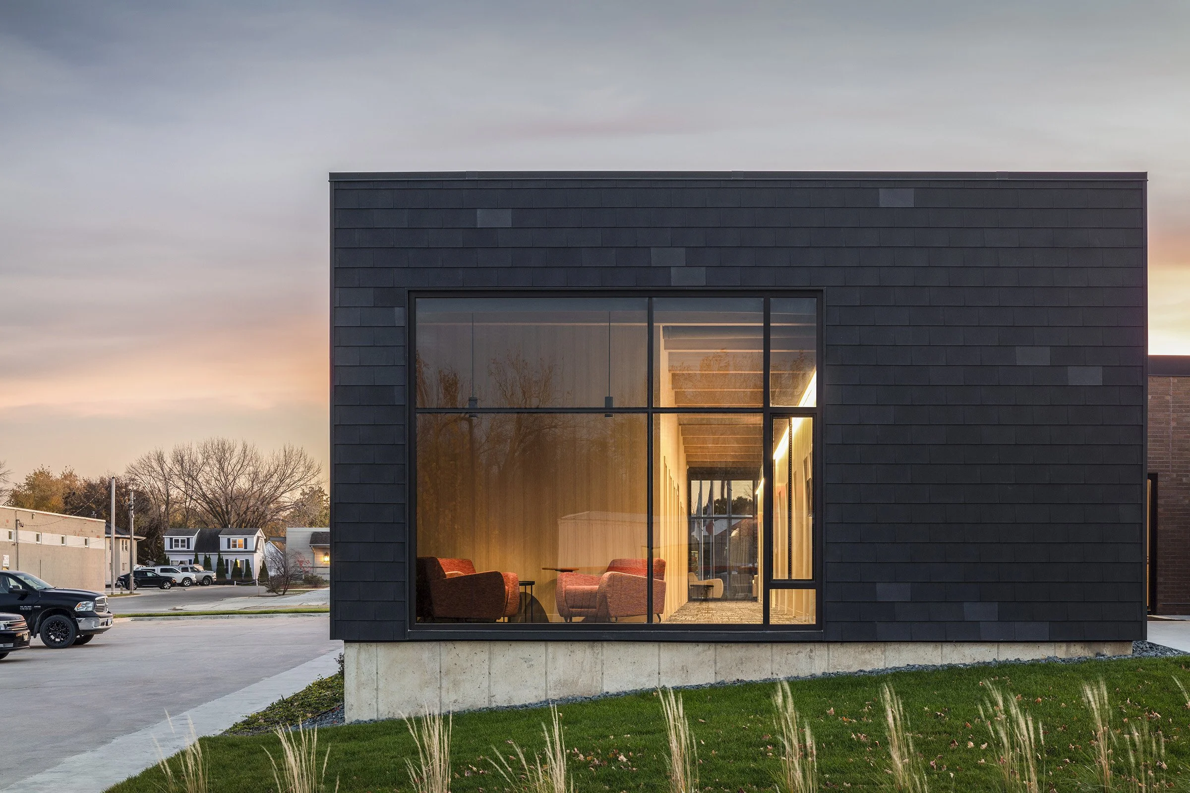 The addition is informed by the concept of a ladder, a critical circulation tool used by firefighters to expedite the process of transporting themselves to areas of need. This concept is expressed down the corridor of the dormitory, funneling personnel in an orderly and unobstructed path toward the apparatus bays. Rungs are mirrored in a central skylight offering an abundance of natural light, which promotes physical and mental well-being in the living quarters during downtime. The dorm exterior expresses strength and protection through the armor-like material and strong, structural integrity of metal plates.